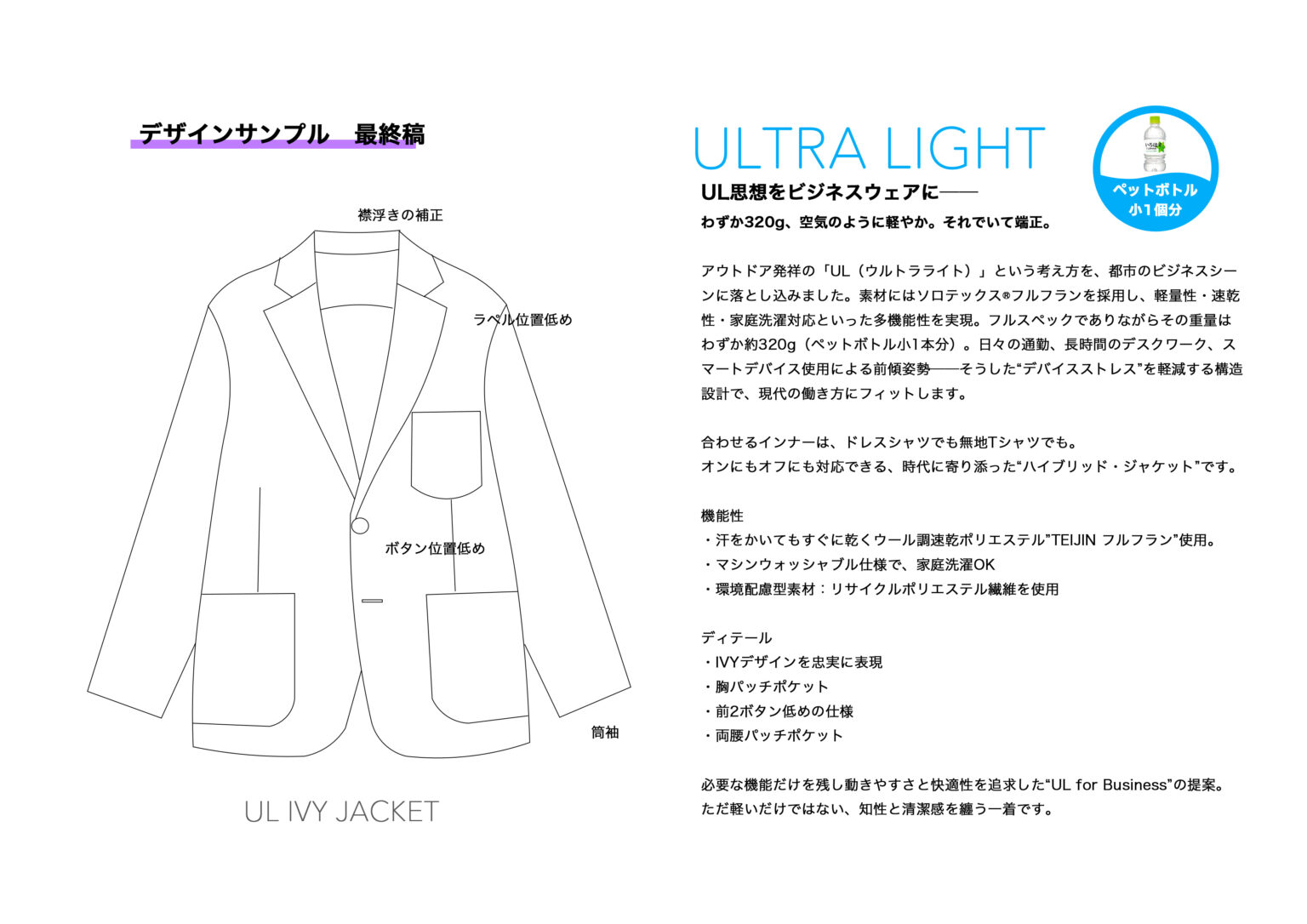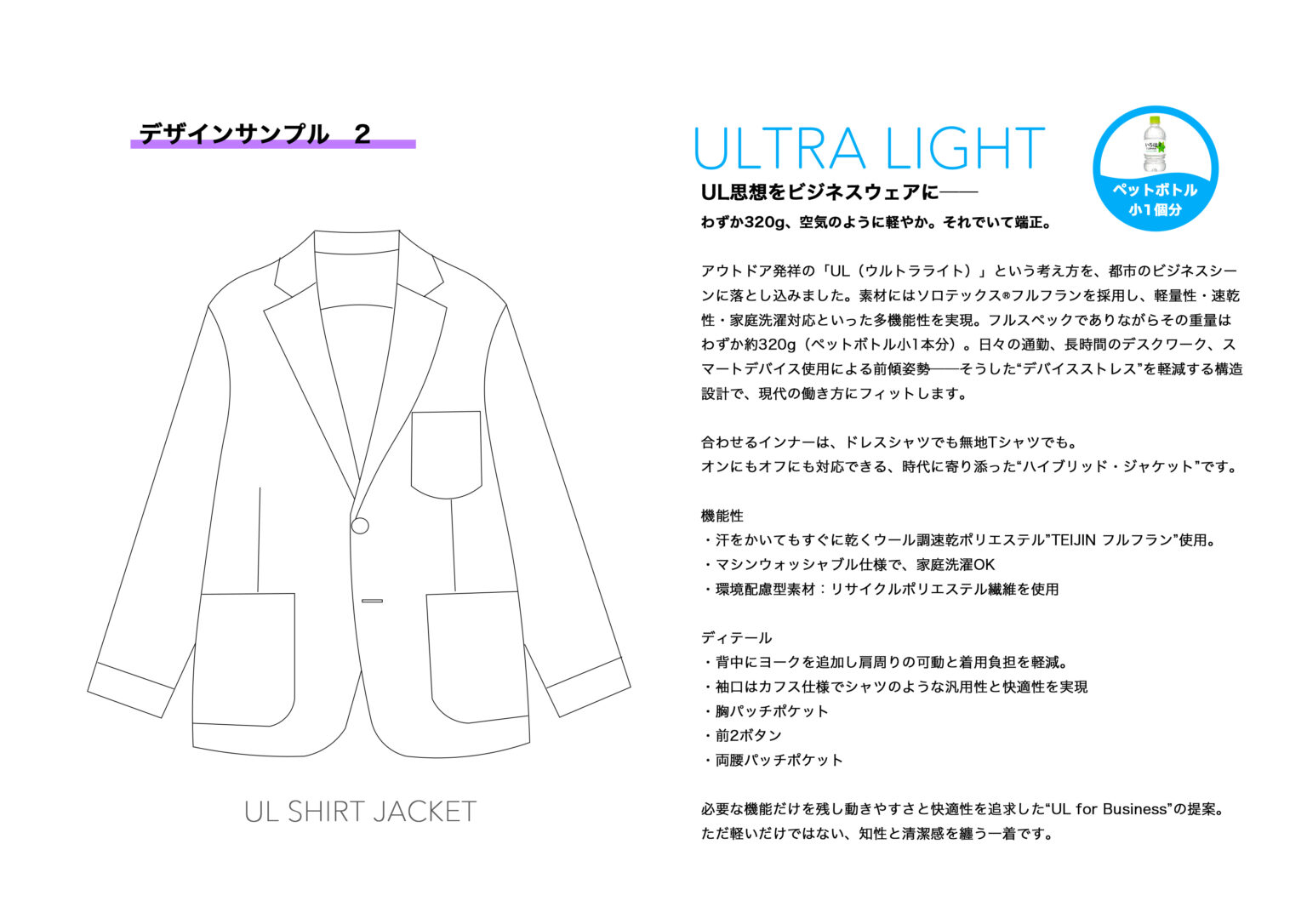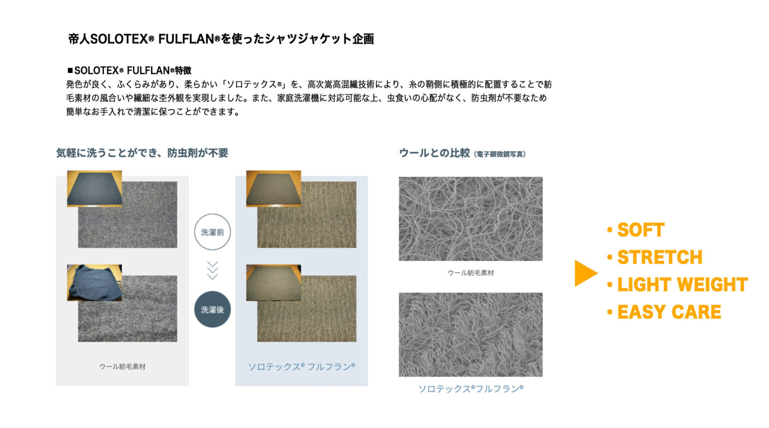 差別化ポイント:・帝人フルフラン(ポリエステル)=高機能素材の信頼感・軽量350g →「シャツの延長」で着られる・手入れ不要・ウォッシャブル → クリーニング不要で毎日使える・動きやすいパターン設計(シャツ屋ならではのパターン理論)