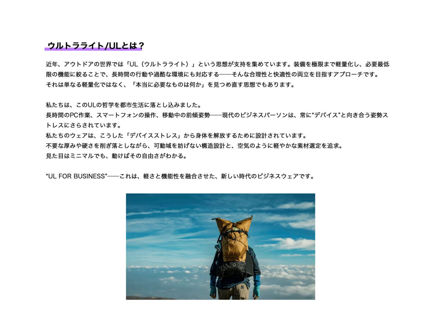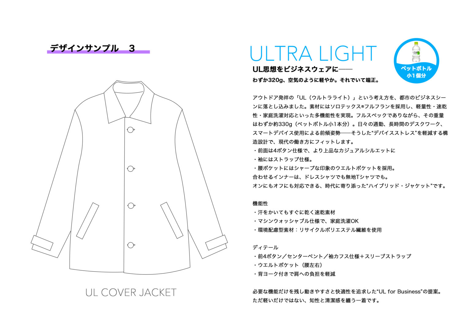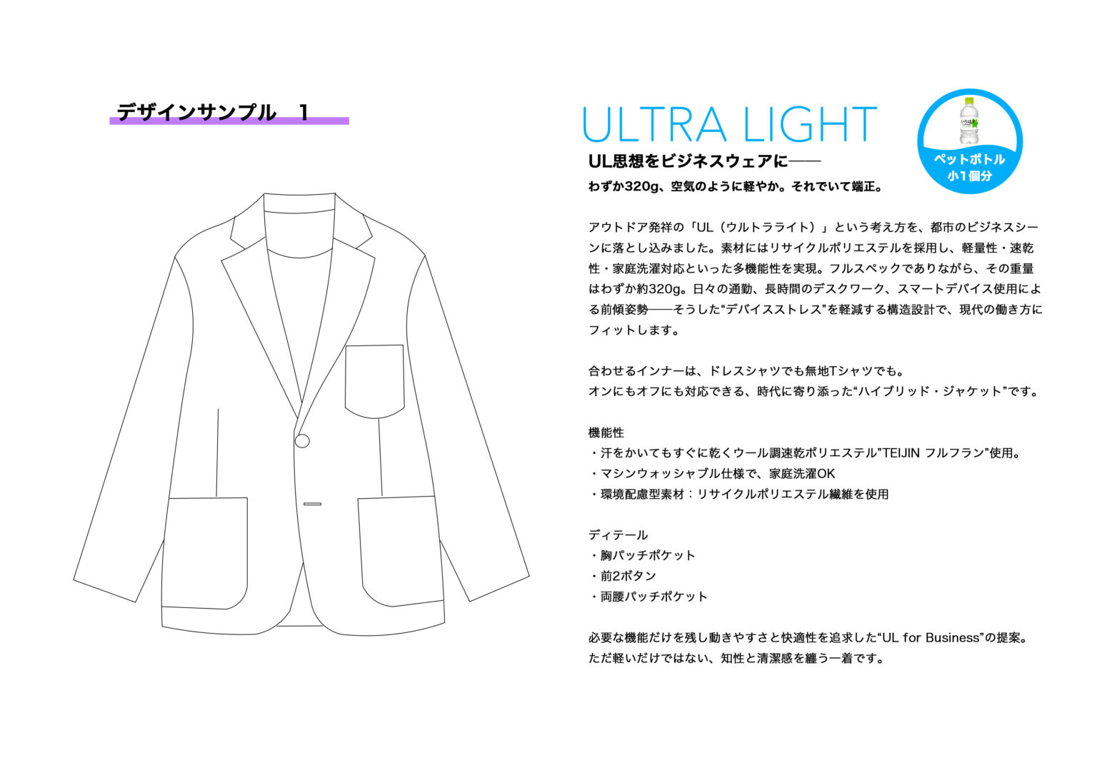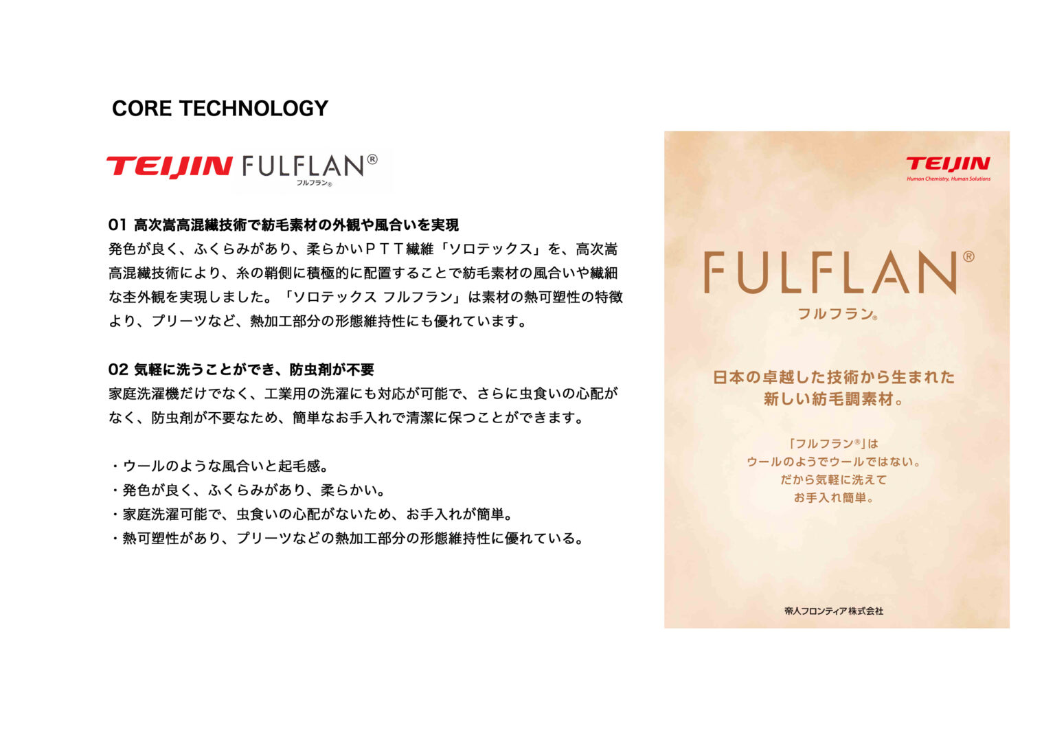 差別化ポイント:・帝人フルフラン(ポリエステル)=高機能素材の信頼感・軽量350g →「シャツの延長」で着られる・手入れ不要・ウォッシャブル → クリーニング不要で毎日使える・動きやすいパターン設計(シャツ屋ならではのパターン理論)