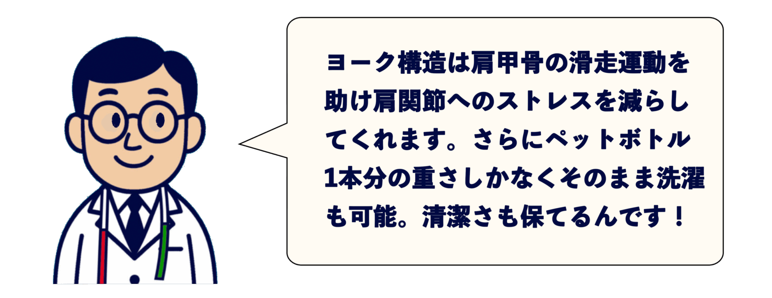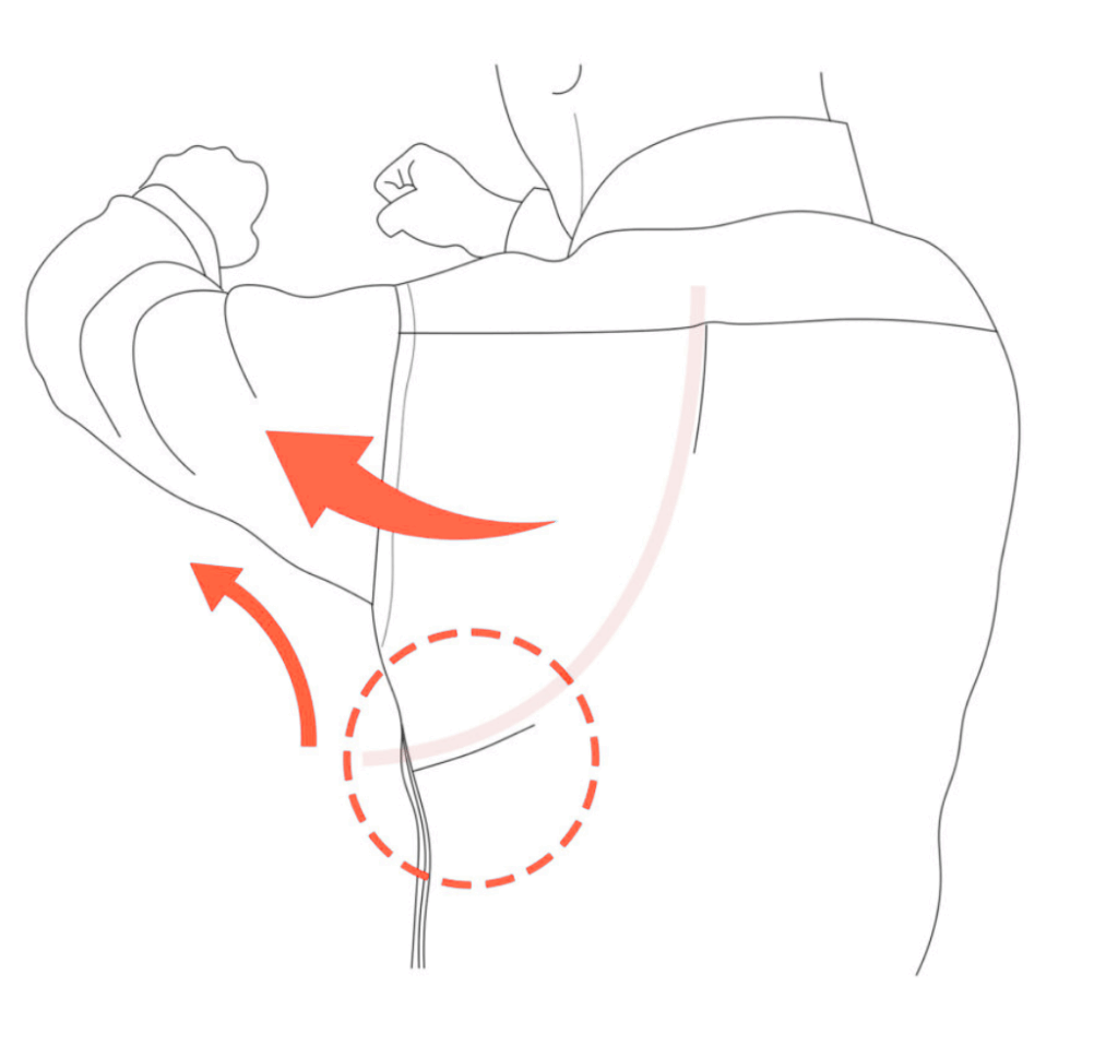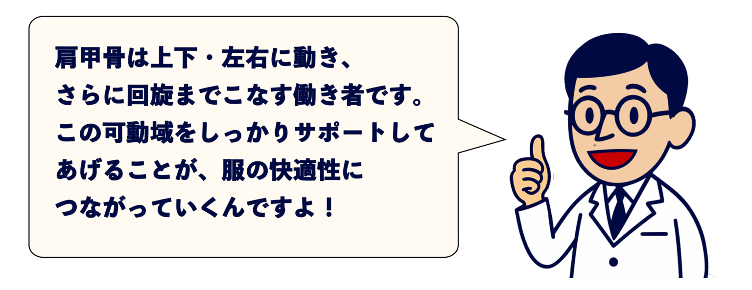 脇下に施したステッチによって背面の生地に肩甲骨に沿った立体的なふくらみが生まれます。この設計により、肩甲骨の滑走運動(肩甲骨が肋骨上を上下・内外に移動する動き)が妨げられず、自然な動きをサポートします。肩甲骨は腕を頭上に上げる際に約60度の上方回旋が必要とされています。この可動をスムーズに確保することは腕の上げ下げや背中の伸展といった日常動作を快適に行う上で欠かせません。